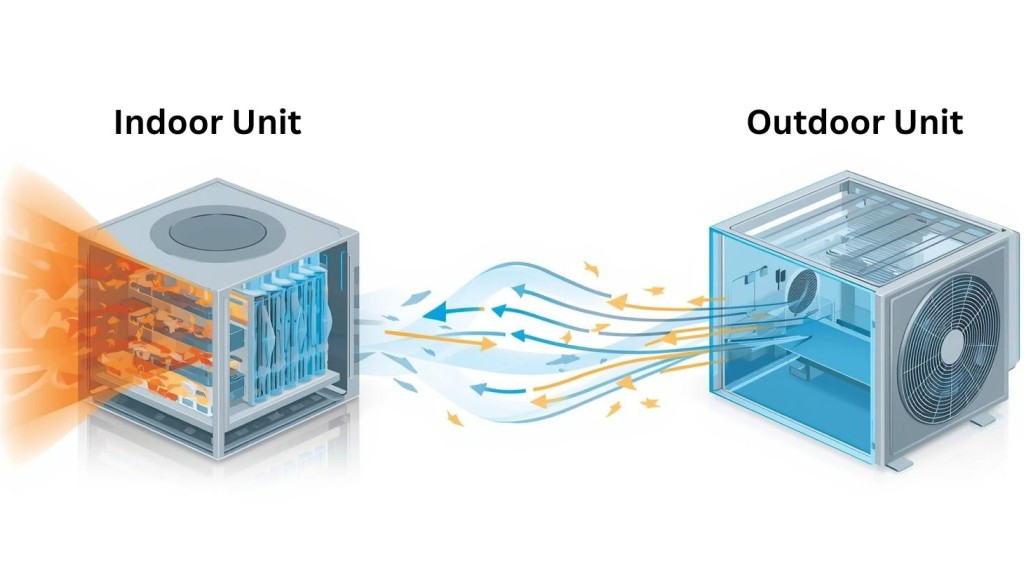 - A thermostat controls the system, automatically switching between heating and cooling to maintain the desired indoor temperature.